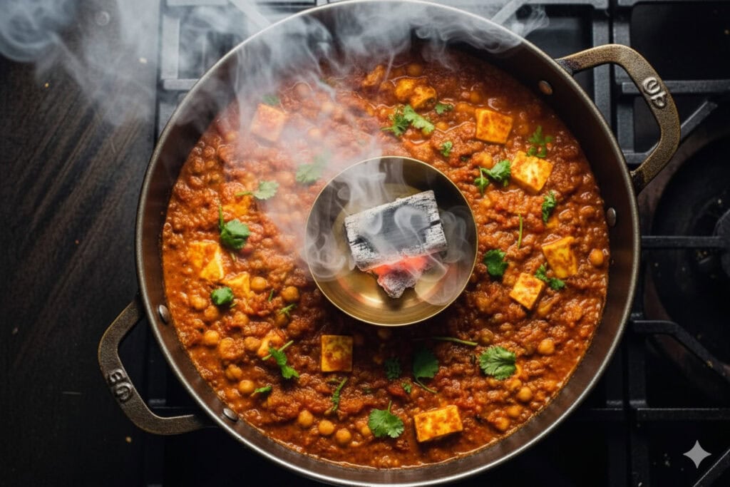 Dann wird ein heißes Stück Kohle in das Öl gelegt, wodurch sofort viel Rauch entsteht. Die Pfanne oder der Topf wird jetzt schnell abgedeckt, damit der Rauch am Essen bleibt.